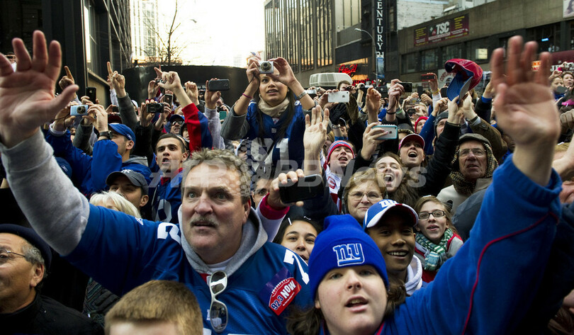 5日の試合でニューイングランド・ペイトリオッツ(New England Patriots)を21-17で破ったジャイアンツの選手たちは、オープントラックの荷台に乗って紙吹雪が舞うブロードウェー(Broadway)をパレードした。