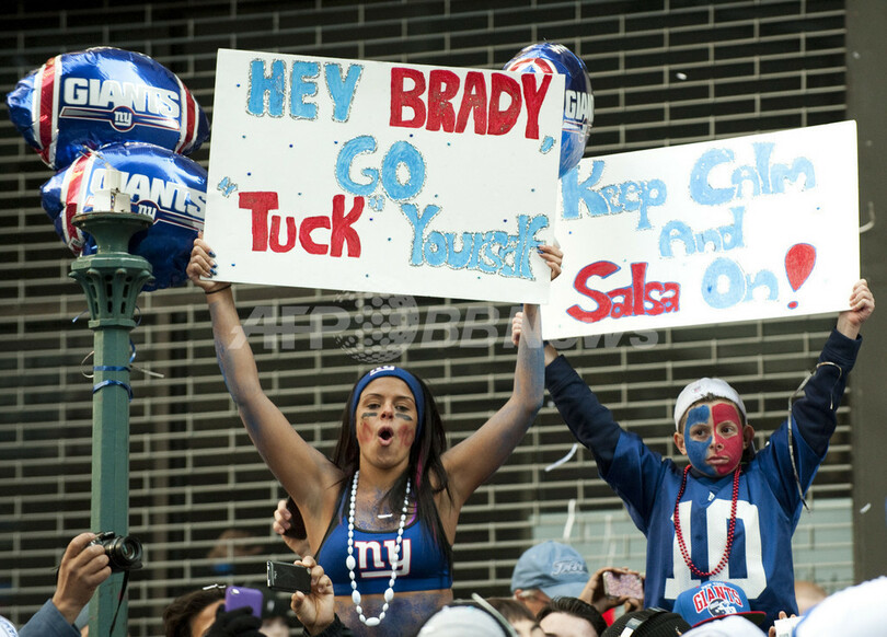 選手に声援を送るニューヨーク・ジャイアンツのファン(2012年2月7日撮影)。(c)AFP/DON EMMERT