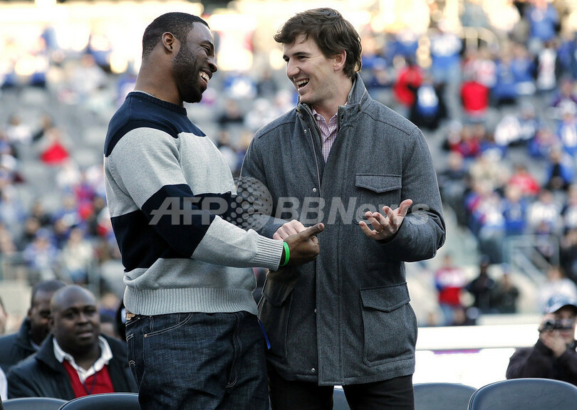 本拠地メットライフ・スタジアム(MetLife stadium)で行われた祝勝会で、チームメイトのジャスティン・タック(Justin Tuck)と談笑するニューヨーク・ジャイアンツのQBイーライ・マニング(Eli Manning、2012年2月7日撮影)。(c)AFP/Getty Images/Jeff Zelevansky