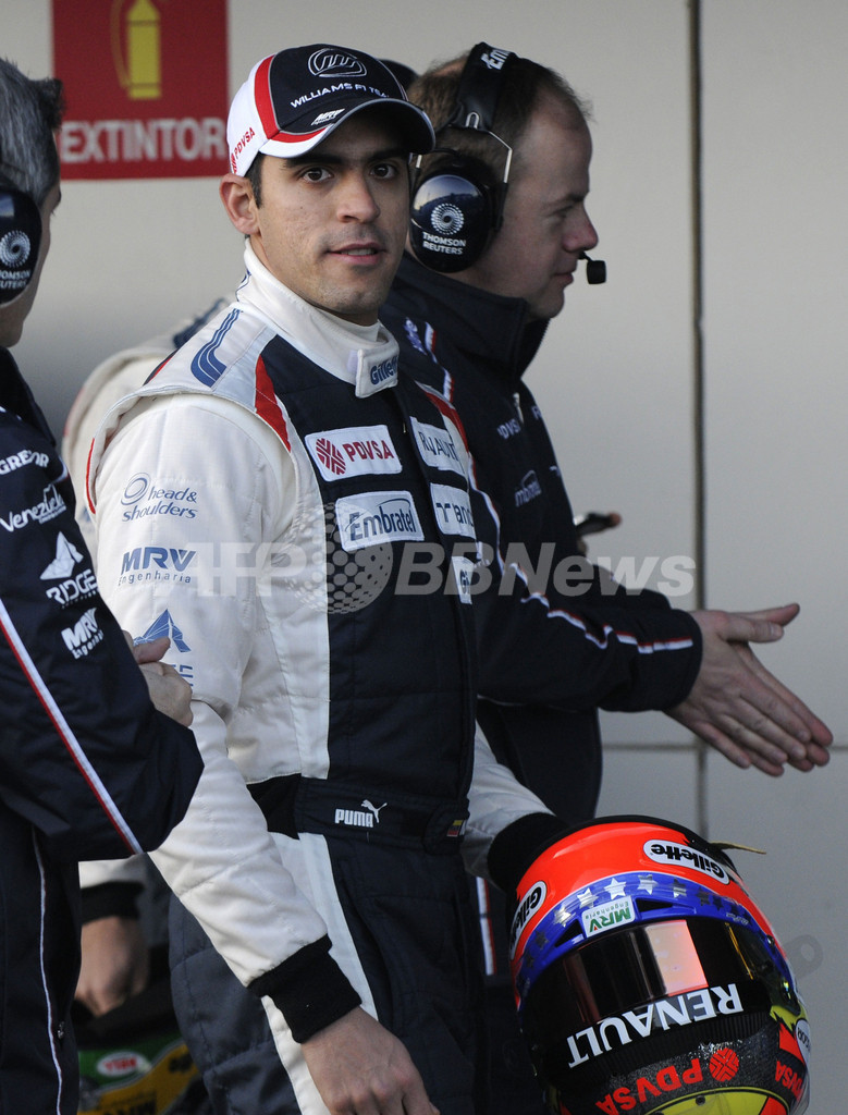 ヘレステストで新型車「FW34」を発表し、会見に出席したウィリアムズ(Williams)のパストール・マルドナド(Pastor Maldonado、2012年2月7日撮影)。(c)AFP/CRISTINA QUICLER<記事本文へ戻る>