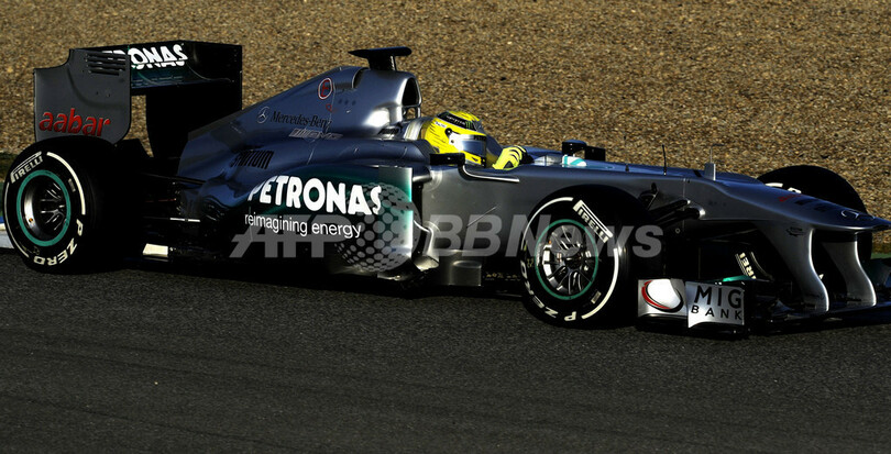 テスト走行で3番手となるベストラップ1分20秒219(56周)を記録したメルセデスGP(Mercedes GP)のニコ・ロズベルグ(Nico Rosberg、2012年2月7日撮影)。(c)AFP/CRISTINA QUICLER<記事本文へ戻る>