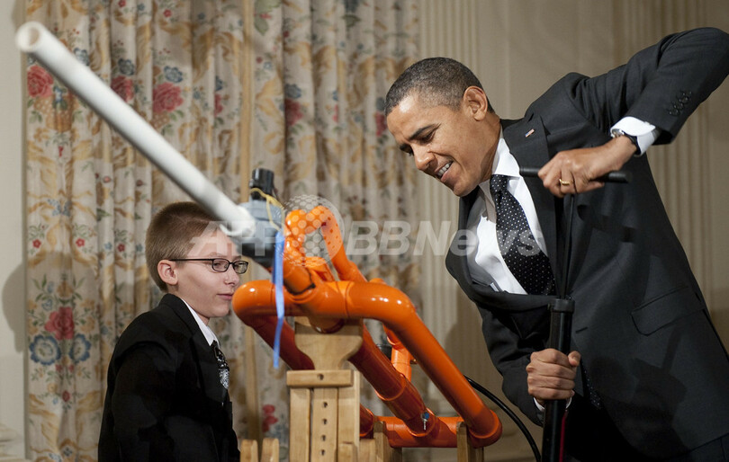 高齢者がインターネット回線を利用し、遠くの親族などと通話を楽しむ目的で作られたロボット「スカイプ・オン・ホイール」を楽しそうに観察したオバマ大統領。ゴミの削減が期待出来る包装ごと溶けるコーヒー用の砂糖など、数々の作品が展示されたが、中でも大統領が注目したのがマシュマロ砲だ。