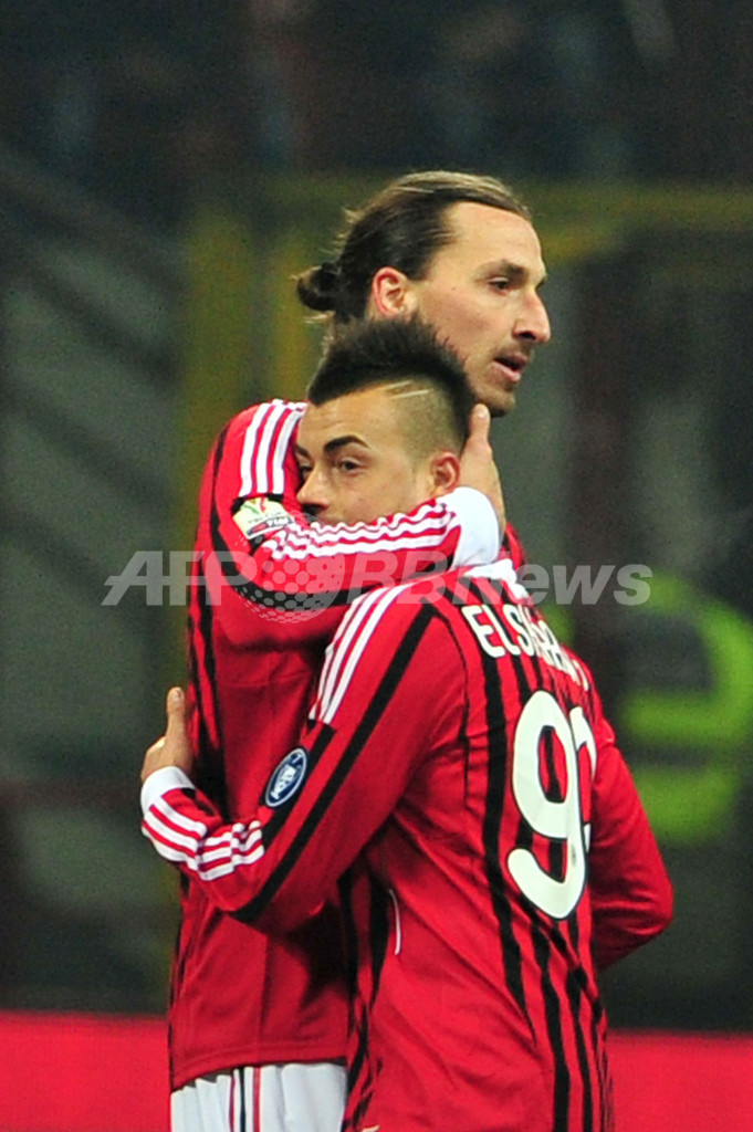 後半17分に同点ゴールを決め、チームメイトのズラタン・イブラヒモビッチ(Zlatan Ibrahimovic)に祝福されるミランのステファン・エル・シャーラウィ(Stephan El Shaarawy、2012年2月8日撮影)。(c)AFP/GIUSEPPE CACACE