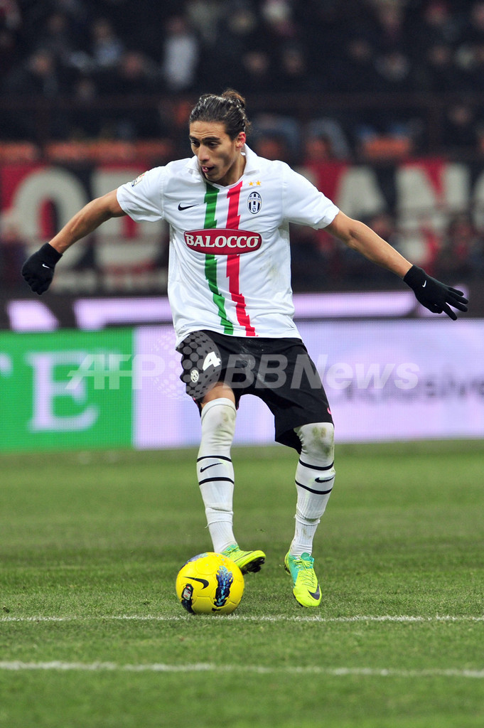 ボールをコントロールするユベントスのマルティン・カセレス(Martin Caceres、2012年2月8日撮影)。(c)AFP/GIUSEPPE CACACE