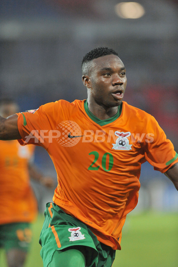 後半33分に決勝点を挙げて歓喜するザンビアのエマヌエル・マユカ(Emmanuel Mayuka、2012年2月8日撮影)。(c)AFP/ABDELHAK SENNA