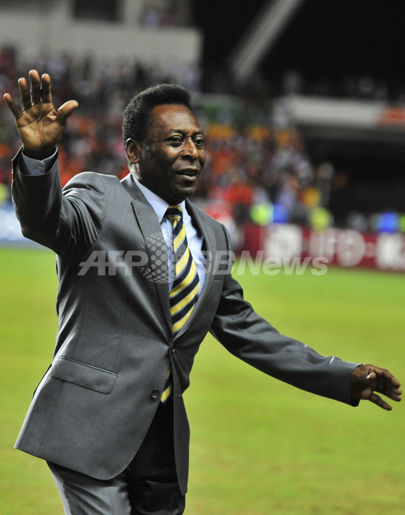 試合前のピッチに登場し、観衆の声援に応える元ブラジル代表のペレ(Pele)氏(2012年2月8日撮影)。(c)AFP/ISSOUF SANOGO