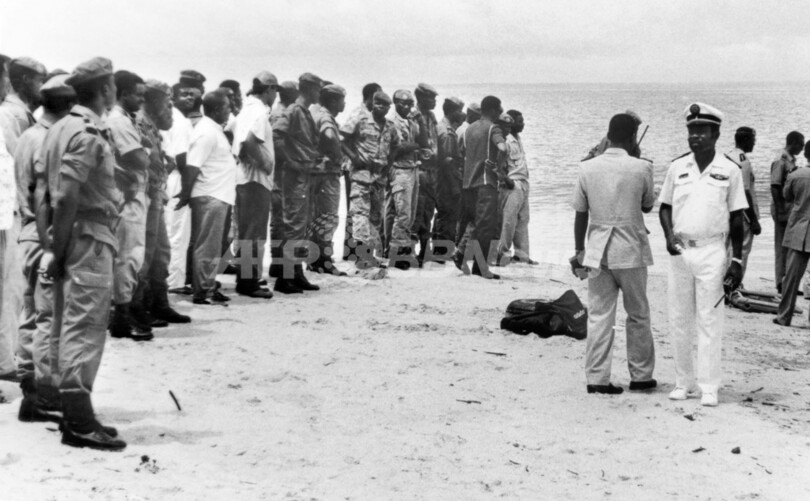 飛行機墜落事故発生現場で捜索するダイバーを浜辺で待つガボンの兵士と救助隊(1993年4月28日撮影)。(c)AFP