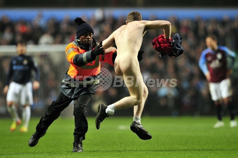 試合中にピッチに乱入した男を止める警備員(2012年2月12日撮影)。(c)AFP/GLYN KIRK