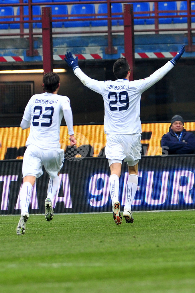 後半11分に先制点を挙げ、歓喜するノヴァーラのアンドレア・カラッチョーロ(Andrea Caracciolo、右、2012年2月12日撮影)。(c)AFP/GIUSEPPE CACACE