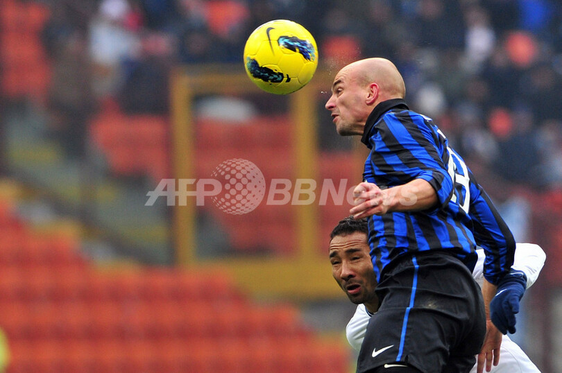 ヘディングするインテルのエステバン・カンビアッソ(Esteban Matias Cambiasso、2012年2月12日撮影)。(c)AFP/GIUSEPPE CACACE