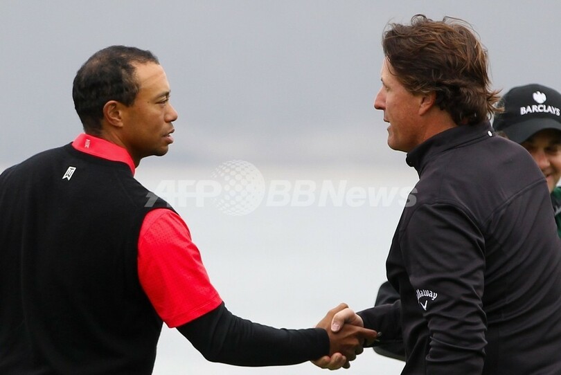 18番ホールのグリーン上で握手を交わすフィル・ミケルソン(右)とタイガー・ウッズ(Tiger Woods、2012年2月12日撮影)。(c)AFP/Getty Images/Ezra Shaw