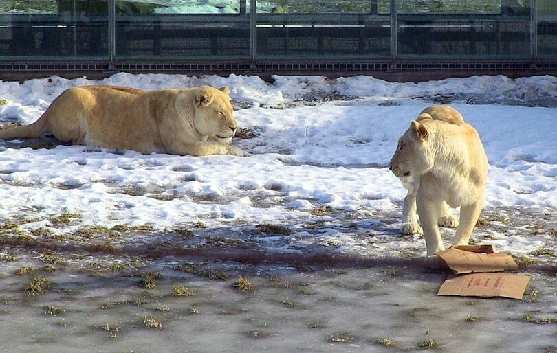 雪の中遊ぶホワイトライオン、冬に慣れたサファリの動物たち カナダ
