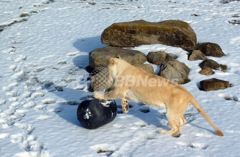 【2月15日 AFP】まるで子ネコが毛糸玉で遊ぶかのように、プラスチック製のドラム缶で遊んでいたホワイトライオンが氷の地面に滑ったと思いきや、すぐに体勢を立て直した。アフリカ出身の肉食獣は、カナダの寒い冬にしっかりと適応したようだ。