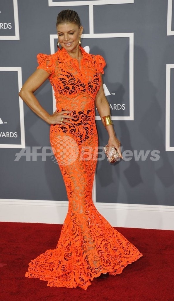 ファーギー(Fergie)はオレンジが鮮やかな「ジャンポール・ゴルチエ(Jean-Paul Gaultier)」のシースルードレスの下からブラックのアンダーウェアをのぞかせ、セクシーに仕上げた。