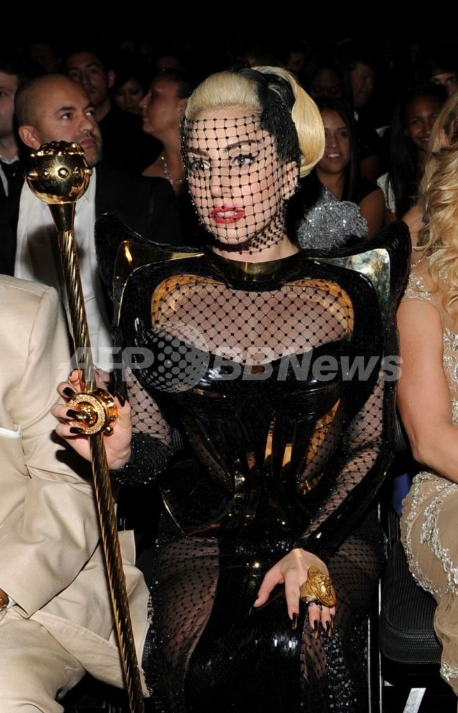 レディー・ガガ(Lady Gaga)も、同じく「ヴェルサーチ」の奇抜なコスチュームを着用。顔を含めた全身を覆うブラックのネットと、角ばったショルダーが印象的だった。淡いベビーピンクのロングドレスをチョイスしたサシャ・グラディーヴァ(Sasha Gradiva)は、肩から腕にかけてメタリックなマシンガン風アクセサリーを装着した。