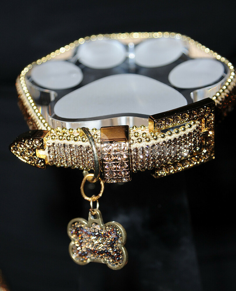 アギーには、スワロフスキーのクリスタルが散りばめられ、骨の形をしたペンダントが付いた「金の首輪(ゴールデン・カラー)」が贈られた。