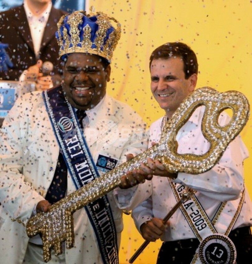 キング・モモは17日、リオへの巨大な鍵を受け取るという象徴的な儀式を行い、これが5日間のカーニバルの幕開けとなる。キング・モモは期間中ほぼノンストップで続くサンバの先導役も務めるため、体力勝負の仕事だ。(c)AFP