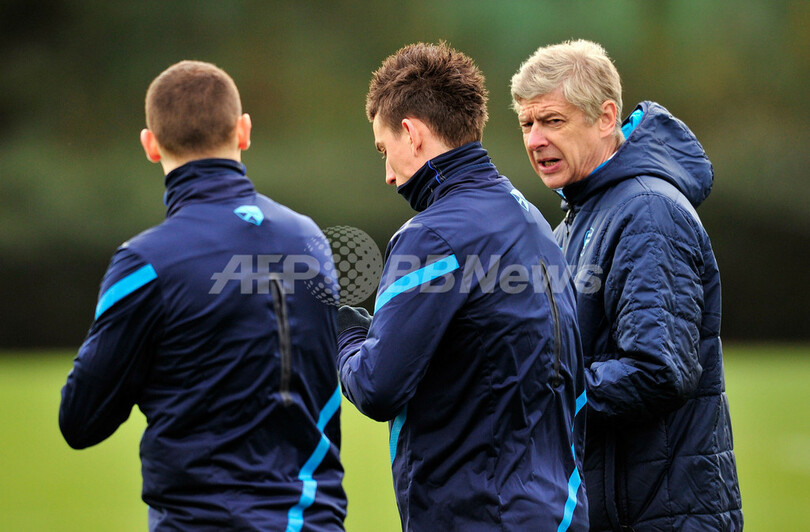 トーマス・フェルマーレン(Thomas Vermaelen、左)、ローラン・コシールニー(Laurent Koscielny、中央)に指示を出すアーセナルのアーセン・ベンゲル(Arsene Wenger)監督(2012年2月14日撮影)。(c)AFP/GLYN KIRK