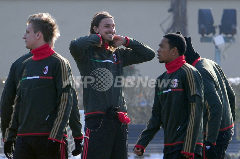 チームメイトと調整を行うACミランのズラタン・イブラヒモビッチ(Zlatan Ibrahimovic、中央、2012年2月14日撮影)。(c)AFP/GIUSEPPE CACACE