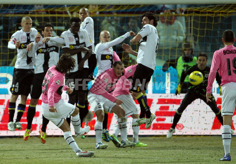 フリーキックを狙うユベントスのアンドレア・ピルロ(Andrea Pirlo、中央、2012年2月15日撮影)。(c)AFP/GIORGIO BENVENUTI