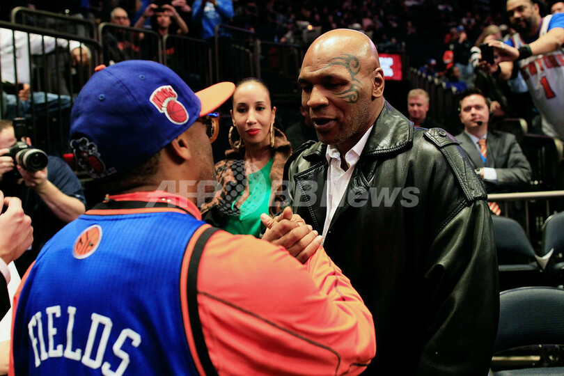 試合前に映画監督のスパイク・リー(Spike Lee、左)と言葉を交わすボクシング・ヘビー級元世界王者のマイク・タイソン(Mike Tyson、2012年2月15日撮影)。(c)AFP/Getty Images/Chris Trotman
