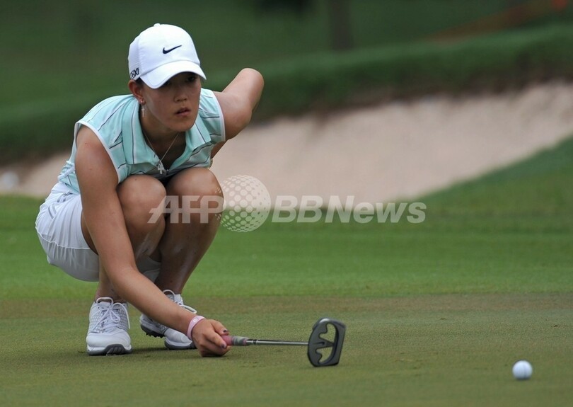 パットのラインを読む米国のミッシェル・ウィ(Michelle Wie、2012年2月17日撮影)。(c)AFP/PORNCHAI KITTIWONGSAKUL