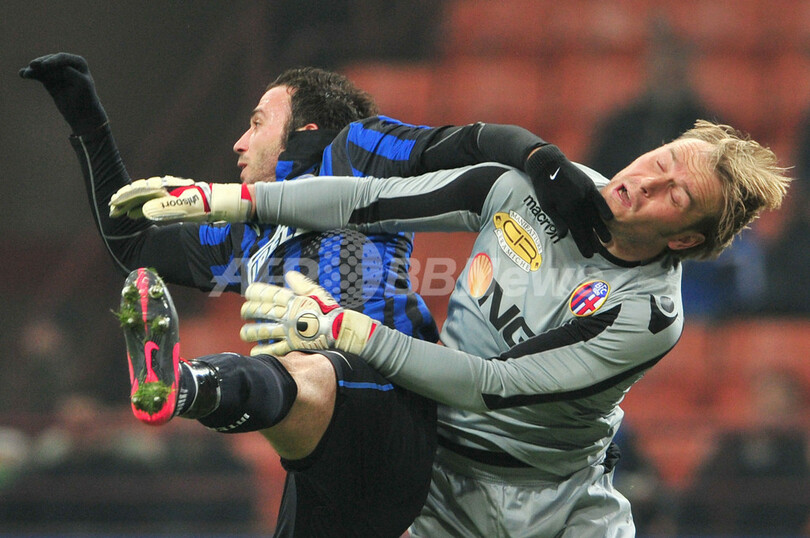 ボローニャのGKジャンフランソワ・ジレ(Jean-Francois Gillet、右)と競り合うインテルのジャンパオロ・パッツィーニ(Giampaolo Pazzini、2012年2月17日撮影)。(c)AFP/GIUSEPPE CACACE
