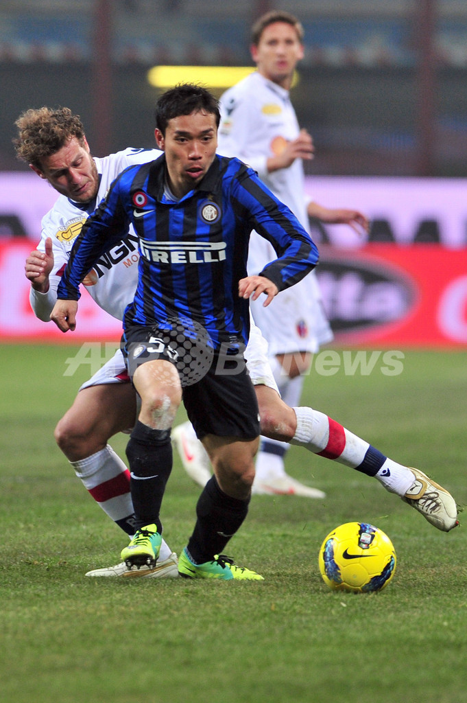 ボローニャのアレッサンドロ・ディアマンティ(Alessandro Diamanti、左)のチェックを受けるインテルの長友佑都(Yuto Nagatomo、2012年2月17日撮影)。(c)AFP/GIUSEPPE CACACE