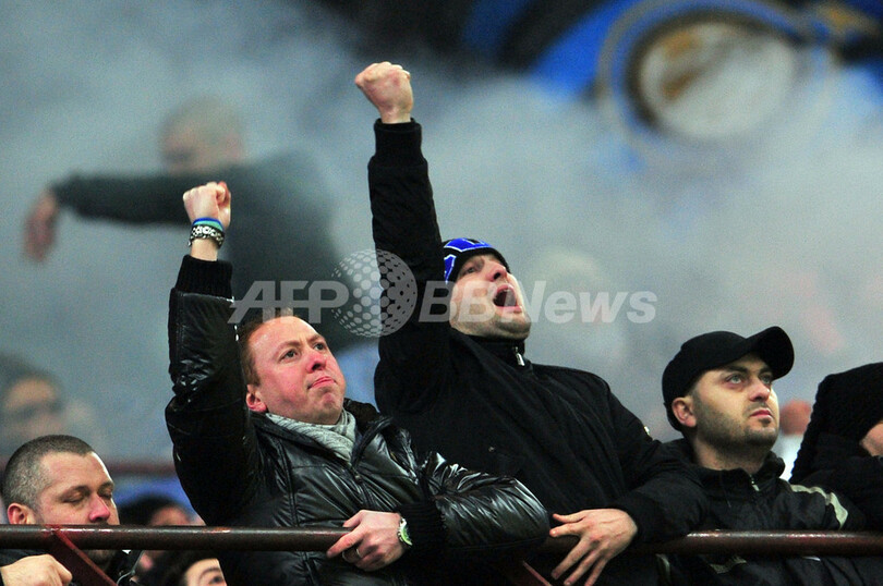 スタンドから抗議するインテルファン(2012年2月17日撮影)。(c)AFP/GIUSEPPE CACACE