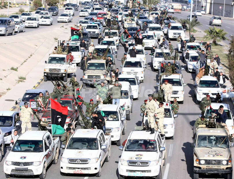 写真は首都トリポリ(Tripoli)で、幹線道路をパレードする新生リビア軍の兵士たち(2012年2月14日撮影)。(c)AFP/MAHMUD TURKIA