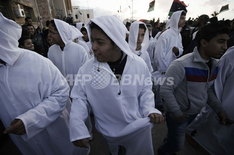 写真は首都トリポリ(Tripoli)で、「革命の殉教者」を表す白い衣装を着てパレードでの出番を待つ若者たち(2012年2月16日撮影)。(c)AFP/MAHMUD TURKIA