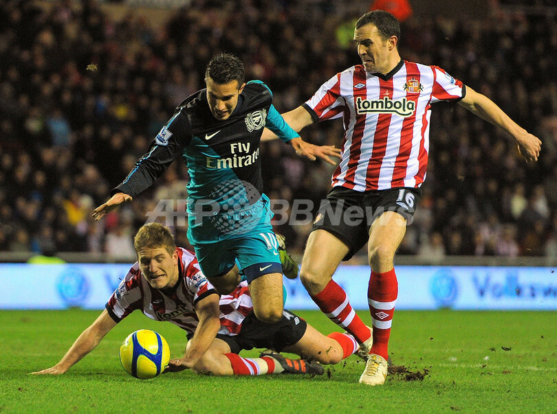 サンダーランドのマイケル・ターナー(Michael Turner、左)、ジョン・オシェイ(John O'Shea、右)とボールを競るアーセナルのロビン・ファン・ペルシー(Robin Van Persie、2012年2月18日撮影)。(c)AFP/ANDREW YATES