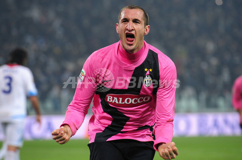 後半29分に勝ち越しゴールを決め歓喜するユベントスのジョルジョ・キエッリーニ(Giorgio Chiellini、2012年2月18日撮影)。(c)AFP/GIUSEPPE CACACE