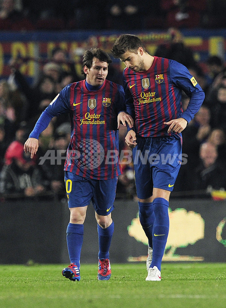 試合中、チームメイトのジェラール・ピケ(Gerard Pique、右)と言葉を交わすFCバルセロナのリオネル・メッシ(Lionel Messi、2012年2月19日撮影)。(c)AFP/JOSEP LAGO