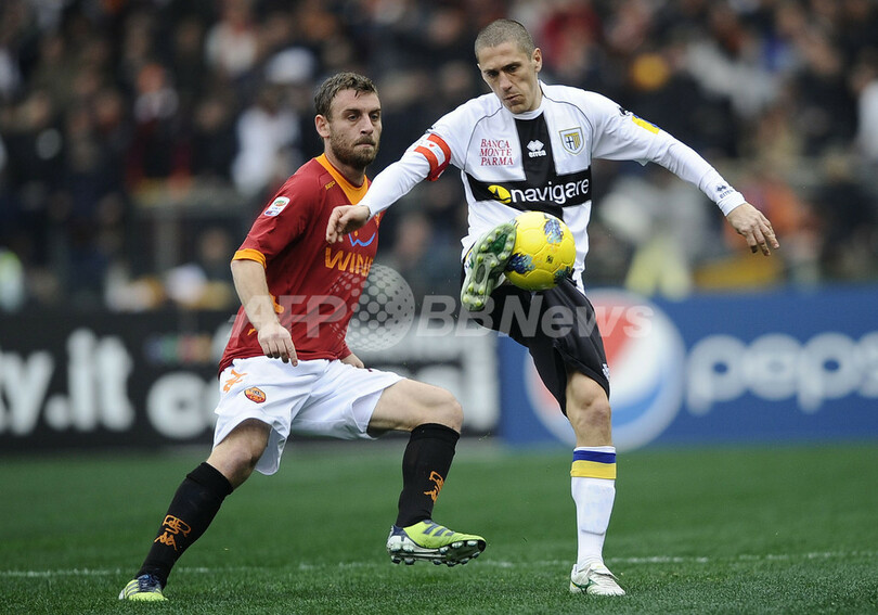 パルマのステファノ・モッローネ(Stefano Morrone、右)とボールを競るローマのダニエレ・デ・ロッシ(Daniele De Rossi、2012年2月19日撮影)。(c)AFP/Filippo MONTEFORTE