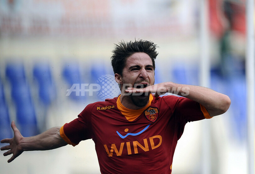前半26分に先制点を挙げ、歓喜するローマのファビオ・ボリーニ(Fabio Borini、2012年2月19日撮影)。(c)AFP/Filippo MONTEFORTE