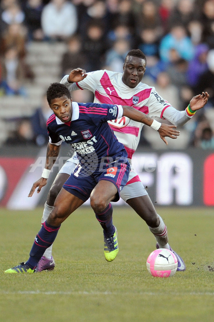 オリンピック・リヨンのミシェル・フェルナンデス・バストス(Michel Fernandes Bastos、左)とボールを競るボルドーのルドヴィク・サーネ(Ludovic Sane、2012年2月18日撮影)。(c)AFP/NICOLAS TUCAT