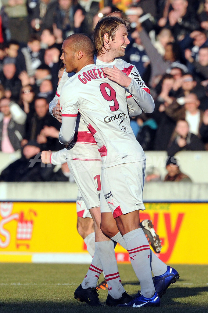 前半41分に先制点を挙げ、チームメイトのヤロスラフ・プラシル(Jaroslav Plasil、右)と抱き合って喜ぶボルドーのヨアン・グフラン(Yoan Gouffran、2012年2月18日撮影)。(c)AFP/NICOLAS TUCAT