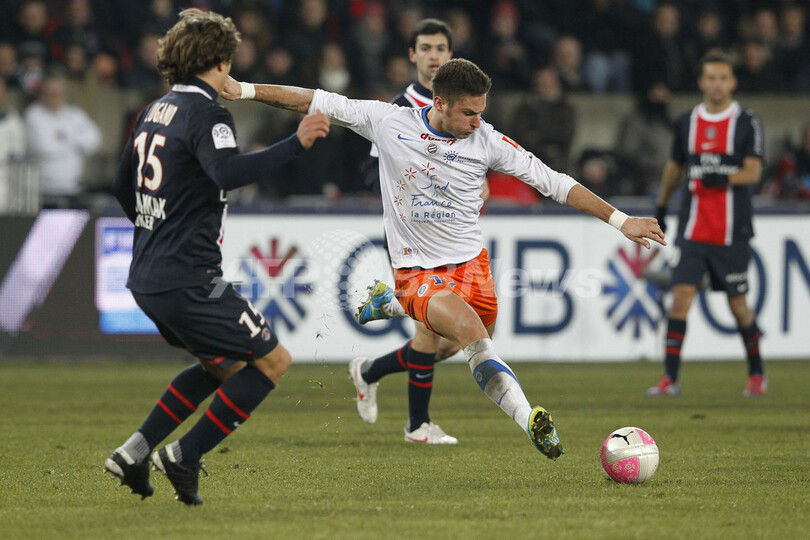 パリ・サンジェルマンのディエゴ・ルガーノ(Diego Lugano、左)とボールを競るモンペリエのオリヴィエ・ジルー(Olivier Giroud、2012年2月18日撮影)。(c)AFP/THOMAS SAMSON