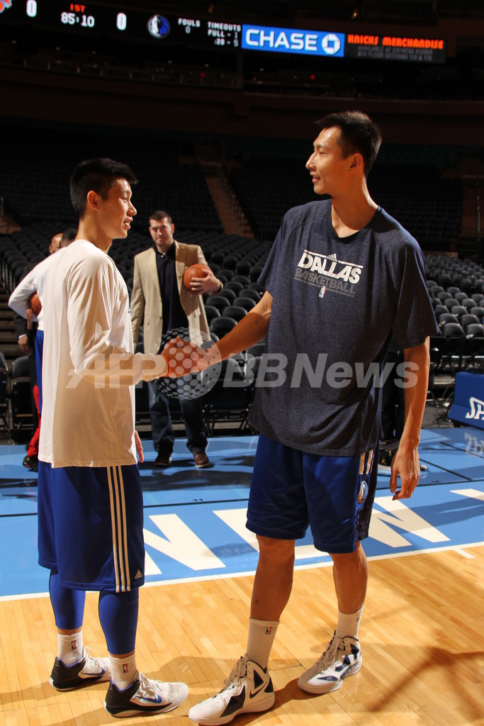 試合前にマーベリックスの易建聯(Yi Jianlian、イ・ジャンリャン、右)と握手を交わすニックスのジェレミー・リン(Jeremy Lin、2012年2月19日撮影)。(c)AFP/Getty Images/NBAE/Nathaniel S. Butler