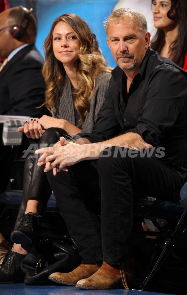 試合を観戦する俳優のケヴィン・コスナー(Kevin Costner、右)と妻のクリスティン・ボームガートナー(Christine Baumgartner、2012年2月19日撮影)。(c)AFP/Getty Images/NBAE/Nathaniel S. Butler