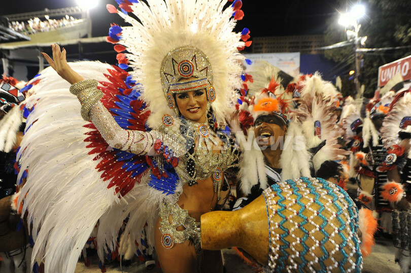 【2月21日 AFP】ブラジル・リオデジャネイロ(Rio de Janeiro)のカーニバルは2日目の20日、最高潮を迎えた。 カーニバル専用会場サンボドロモ(Sambadrome)には7万人の観衆が集まり、裸に近い衣装姿のダンシングクイーンたちに、想像力豊かな山車(だし)、数千人規模のエキストラたちが登場した。リオのカーニバルは18日夜に花火とともに開幕した。カーニバル参加者は開幕の数日前から路上でパーティーを繰り広げていた。(c)AFP
