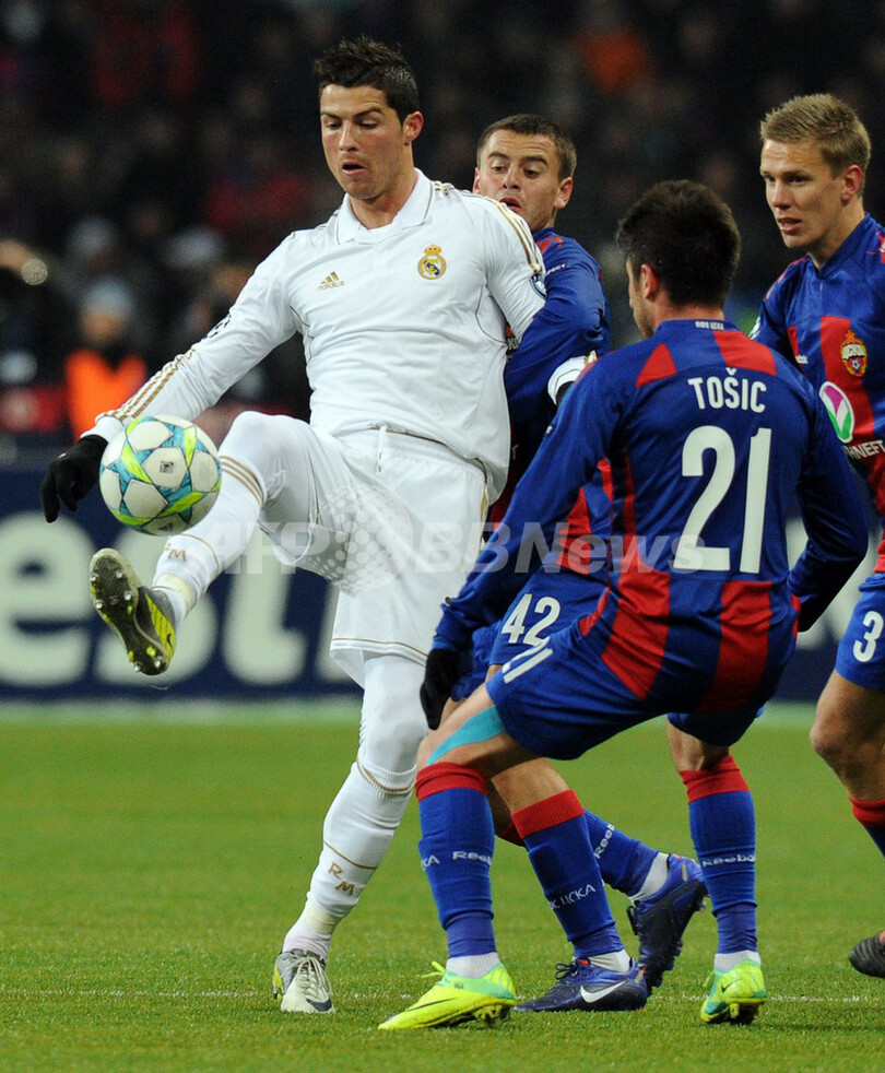 CSKAモスクワの選手に囲まれながらもボールをコントロールするレアル・マドリードのクリスティアーノ・ロナウド(Cristiano Ronaldo、2012年2月21日撮影)。(c)AFP/KIRILL KUDRYAVTSEV