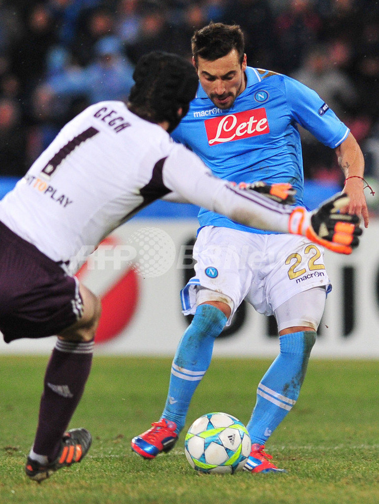 後半20分にチーム3得点目を挙げるナポリのエセキエル・ラベッシ(Ezequiel Lavezzi、2012年2月21日撮影)。(c)AFP/ALBERTO PIZZOLI
