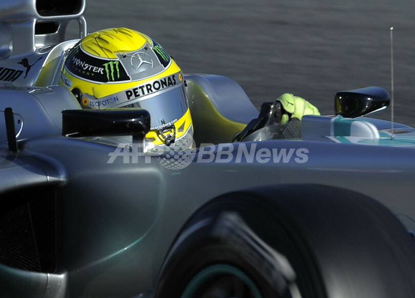 テスト走行で7番手となるベストラップ1分24秒555(82周)を記録したメルセデスAMG(Mercedes AMG)のニコ・ロズベルグ(Nico Rosberg、2012年2月22日撮影)。(c)AFP/LLUIS GENE