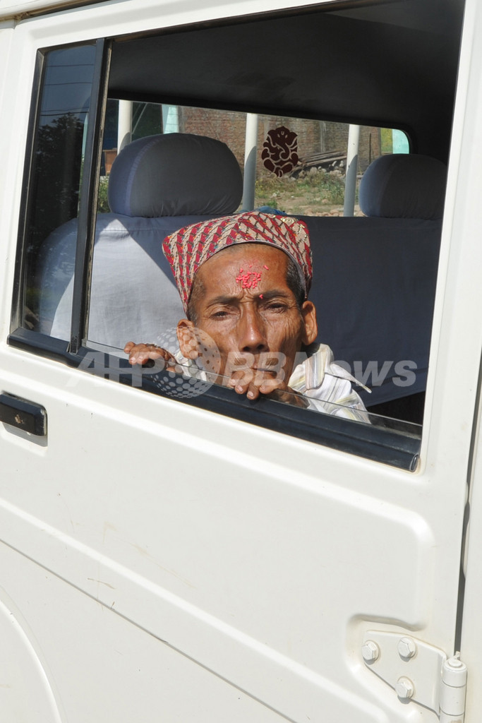 写真は、ダン郡のHafure村で、車の後部座席に乗ったダンギさん(2012年2月21日撮影)。(c)AFP/Prakash MATHEMA