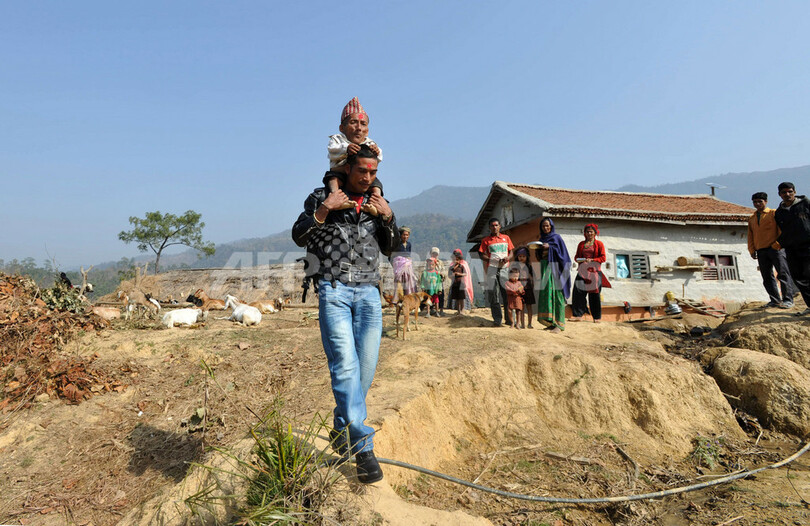 写真は、ダン郡のHafure村で、おいに肩車されるダンギさん(2012年2月21日撮影)。(c)AFP/Prakash MATHEMA