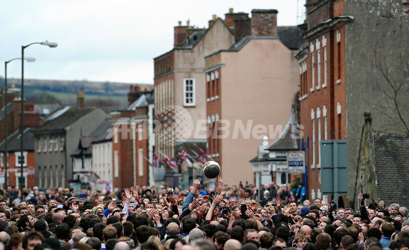 毎年、キリスト教「灰の水曜日(Ash Wednesday)」に行われる、このフットボール大会は、町全体をピッチに見立て、約5キロ離れたゴールを目指し、数千人の住民がひとつのボールを追いかけて町中を走り回る豪快なスポーツで、数百年の伝統を持つ。(c)AFP