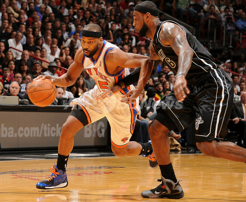 ヒートのレブロン・ジェームズ(LeBron James)にドライブを仕掛けるニックスのバロン・デイビス(Baron Davis、2012年2月23日撮影)。(c)AFP/Getty Images/NBAE/Andrew D. Bernstein