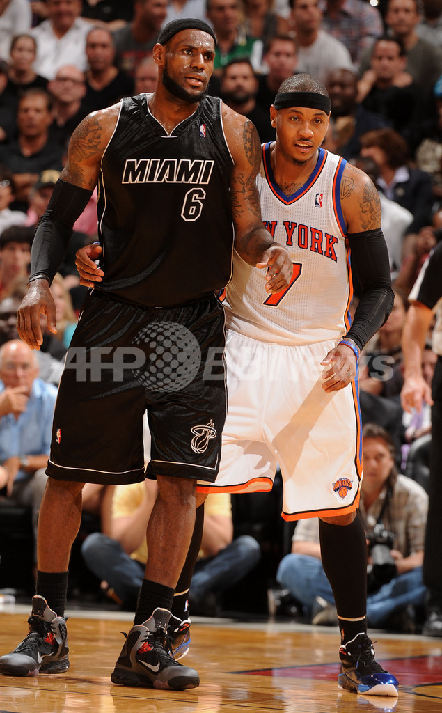 ニックスのカーメロ・アンソニー(Carmelo Anthony)のマークを受けるヒートのレブロン・ジェームズ(LeBron James、2012年2月23日撮影)。(c)AFP/Getty Images/NBAE/Andrew D. Bernstein